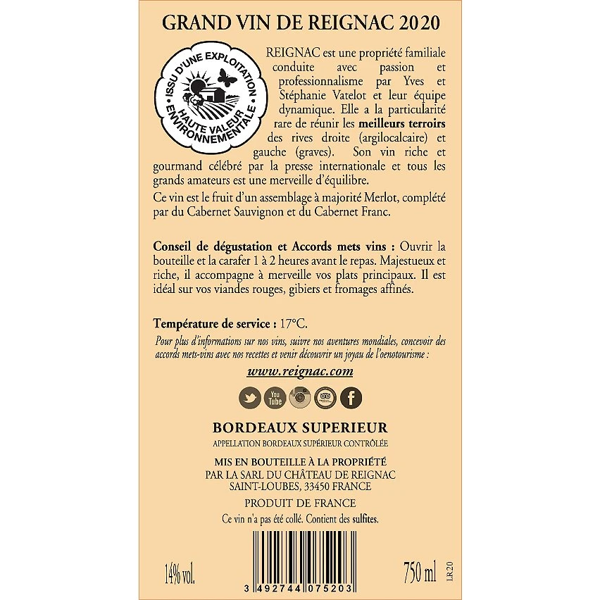 REIGNAC est une propriété familiale conduite avec passion et professionnalisme par Yves et Stéphanie Vatelot et leur dynamique équipe. Elle a la particularité rare de réunir les meilleurs terroirs des rives droite (argilo-calcaire) et gauche (graves). Son vin riche et gourmand célébré par la presse internationale et tous les grands amateurs est une merveille d’équilibre.